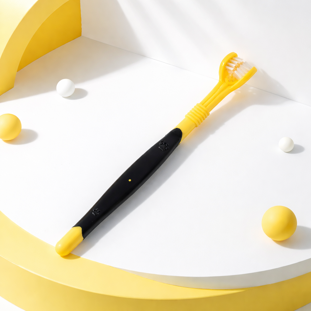 Pet oral hygiene toothbrush showing three-sided brush head for effective cleaning